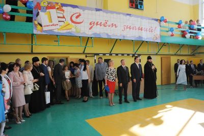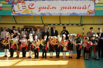 В День знаний в отремонтированном спортивном зале школы собрались учащиеся, педагоги и родители. Первые ряды заняли нарядные первоклассники с огромными букетами цветов. В этом году в средней школе №1 имени Героя Советского Союза Е.И. Стерина открыто два первых класса – за парты сели 56 первоклассников.