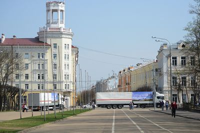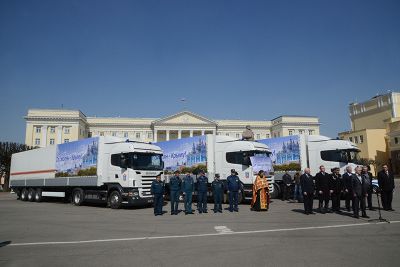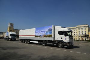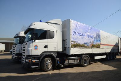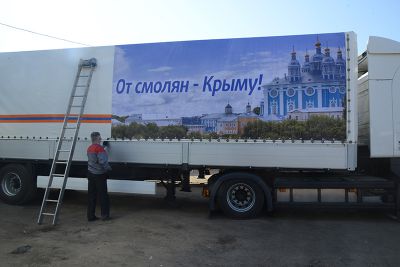 В Смоленской области завершился сбор гуманитарной помощи жителям Крыма. Крупная партия продуктов питания, медикаментов и медицинского оборудования отправилась сегодня с центральной площади областного центра на трёх большегрузных автомобилях, предоставленных МЧС России.