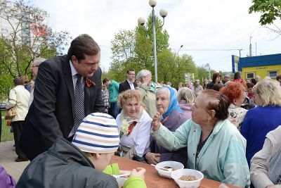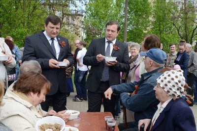 Далее Губернатор направился на площадку около Дома культуры «Шарм», где Алексей Островский вместе со смолянами отведал «солдатской» каши.