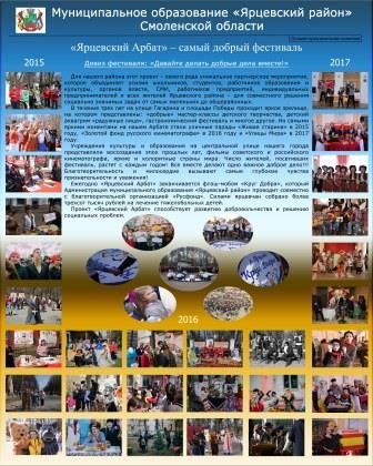 Три года подряд в городе Ярцеве проходит фестиваль «Ярцевский Арбат», который уже успел полюбиться местным жителям. Данный фестиваль – является партнерским мероприятием, реализуемым силами местной администрации и Российским фондом помощи (Русфонд).