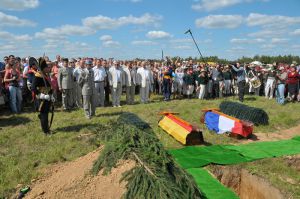 After the reconstruction the reburying of remains of two soldiers of the Napoleonic army as a solemn ceremony took place. Representatives of the Embassy of France in Russia including military attaché Filipp Despinua came to Smolensk.