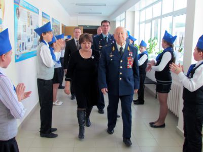 Aleksey Leonov arrived into school named after his name while children communicated with young cosmonauts. Schoolchildren friendly applauded when Aleksey Leonov appeared in corridor: they not only know after whose name their school is named but constantly communicate with their hero and idol. Scholl museum is opened also for guests of educational institution, is replenished with new exhibits that are given to children by Aleksey Leonov.