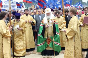 The Head of the Russian Orthodox Church was accompanied by the governor of Bryansk region Nikolay Denin and the governor of Smolensk region Sergey Antufiev. After the meeting of the Patriarch Kirill at the airport of Bryansk the delegation went to Klimovsky district of Bryansk region by helicopter, where meetings of fraternal peoples have been organized since 1969 at the border of three fraternal nations. In 1975 the Monument of Friendship was built, and 20 years ago a cross of adoration was placed on the Russian territory. Nowadays the Festival of Slavonic Peoples is a big international event and more than ten thousands of citizens from Russia, Belarus and Ukraine, heads of states and frontier regions, cultural and art figures, youth and public organizations took part in it.