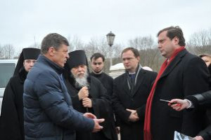 After that Deputy Prime Minister went to the Saint Assumption Cathedral. Bishop of Smolensk and Vyazma Panteleimon asked the Governor to solicit for the reallocation of the federal budget funds provided by the plan of 2013 for the restoration of the Avraamiev Coventry and to allocate them for the restoration of the Sobornaya hill architectural ensemble: the stairs, the fence with the breast walls, the consistory (the new building housing the Archive).
