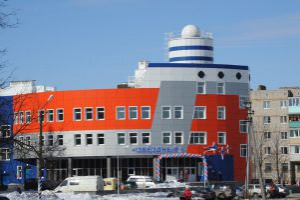 The "Zvezdniy" center is a complex designed for children and youth to take part in various clubs. There is a lobby, a security post, a cloakroom, a canteen, an art studio, a carpenter's workshop, table tennis facilities, dance and ballet halls, a costume room, showers and toilets on the ground floor. There is a foyer, an assembly hall for 206 people, a stage, artistic and theatrical facilities, a drama club, crafts workshops, sport and tourism clubs, a room for 40 people and technical facilities on the first floor. There is a foyer, an assembly hall, a stage, a projection room, an exhibition hall, different clubs: photo, cinema and video club, space and astronomy club, aviation and marine modeling club, music and humanities culb on the second floor. The third floor houses the planetarium.