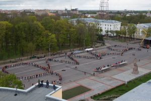 After the hundreds of participants lined up from the entrance to the “Lopatinsky” park to the crossing of Lenin Square with the roadway, the two soldiers began to unwind the ribbon, which was at that very moment picked up by the hands of the flash-mob participants.