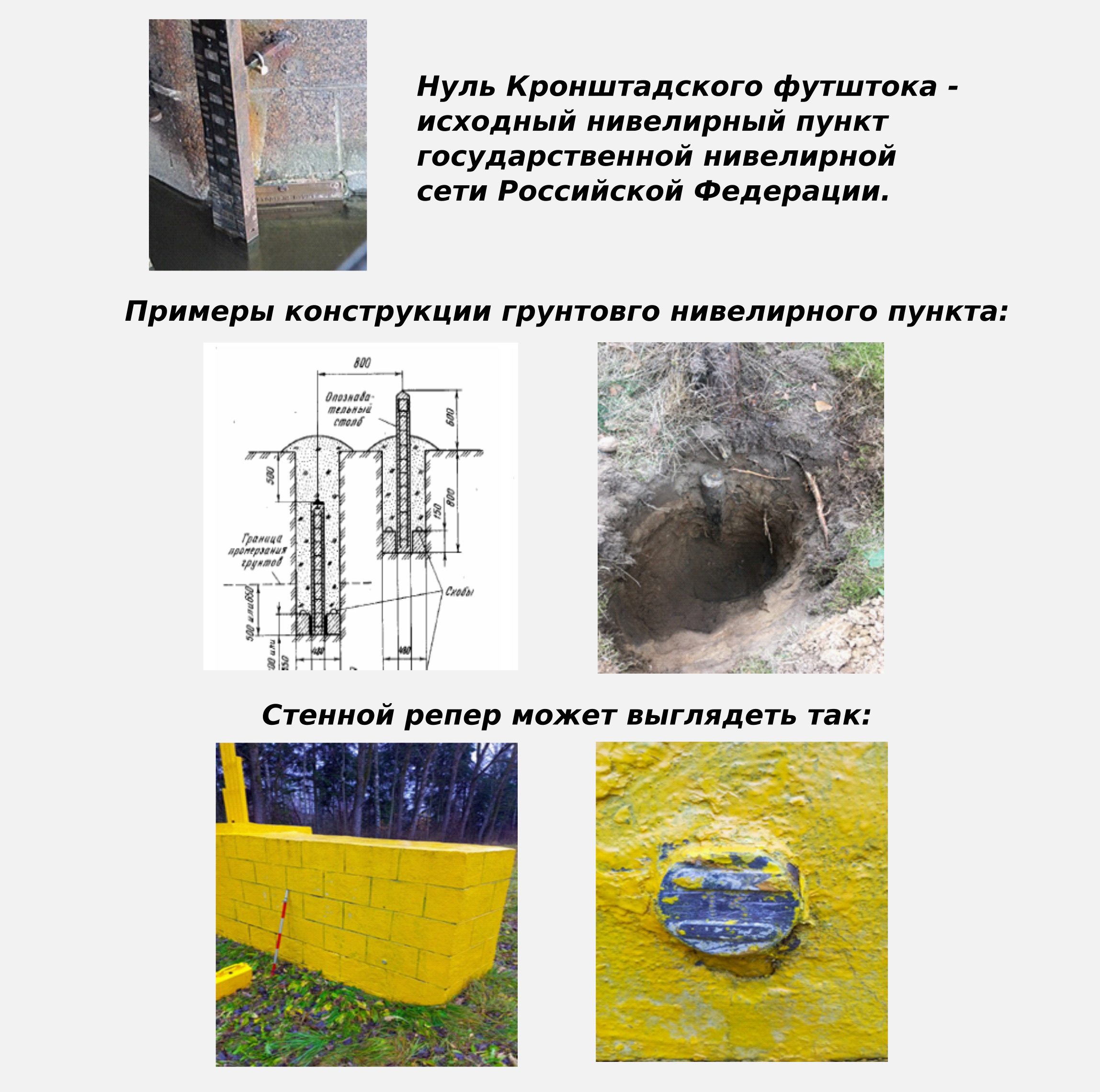 Исходным нивелирным пунктом государственной нивелирной сети Российской Федерации является нуль Кронштадтского футштока горизонтальная черта на медной пластине, установленной на устое Синего моста через Обводный канал.