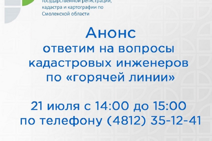 Управление Росреестра по Смоленской области проведет 21 июля с 14:00 до 15:00 «горячую линию» для ответов на вопросы кадастровых инженеров.