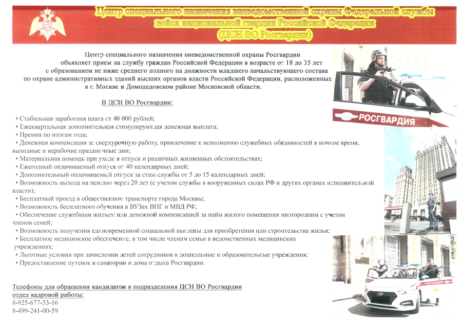 Центр специального назначения вневедомственной охраны Росгвардии объявляет прием на службу граждан Российской Федерации в возрасте от 18 до 35 лет с образованием не ниже среднего полного на должности младшего начальствующего состава по охране административных зданий высших органов власти Российской Федерации, расположенных в г. Москва и Домодедовском районе Московской области.