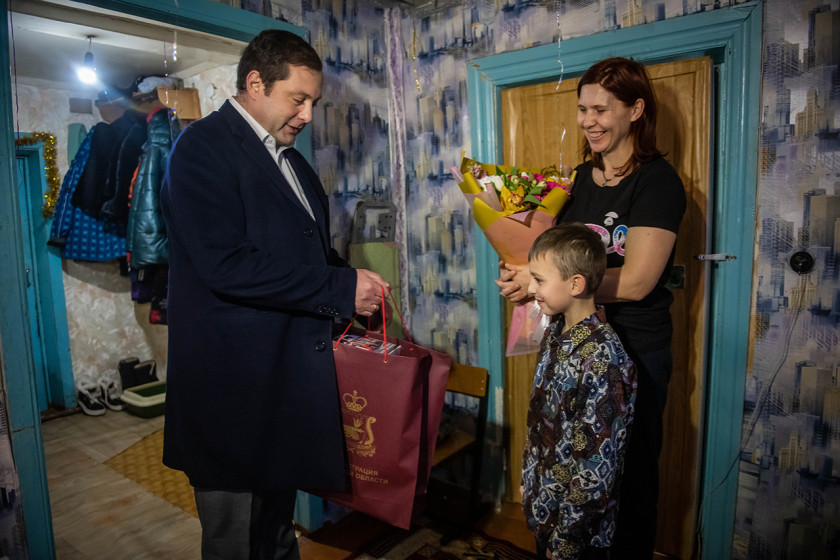 Алексей Островский лично вручил Кириллу подарок – пожарную машину на пульте управления с мигалкой, букет цветов его маме Диане Анатольевне, а сестрам Анжелике, Виолетте и Владе – сладкие подарки. Дети, только что вернувшиеся с областного новогоднего праздника в Драматическом театре, очень обрадовались такому сюрпризу.