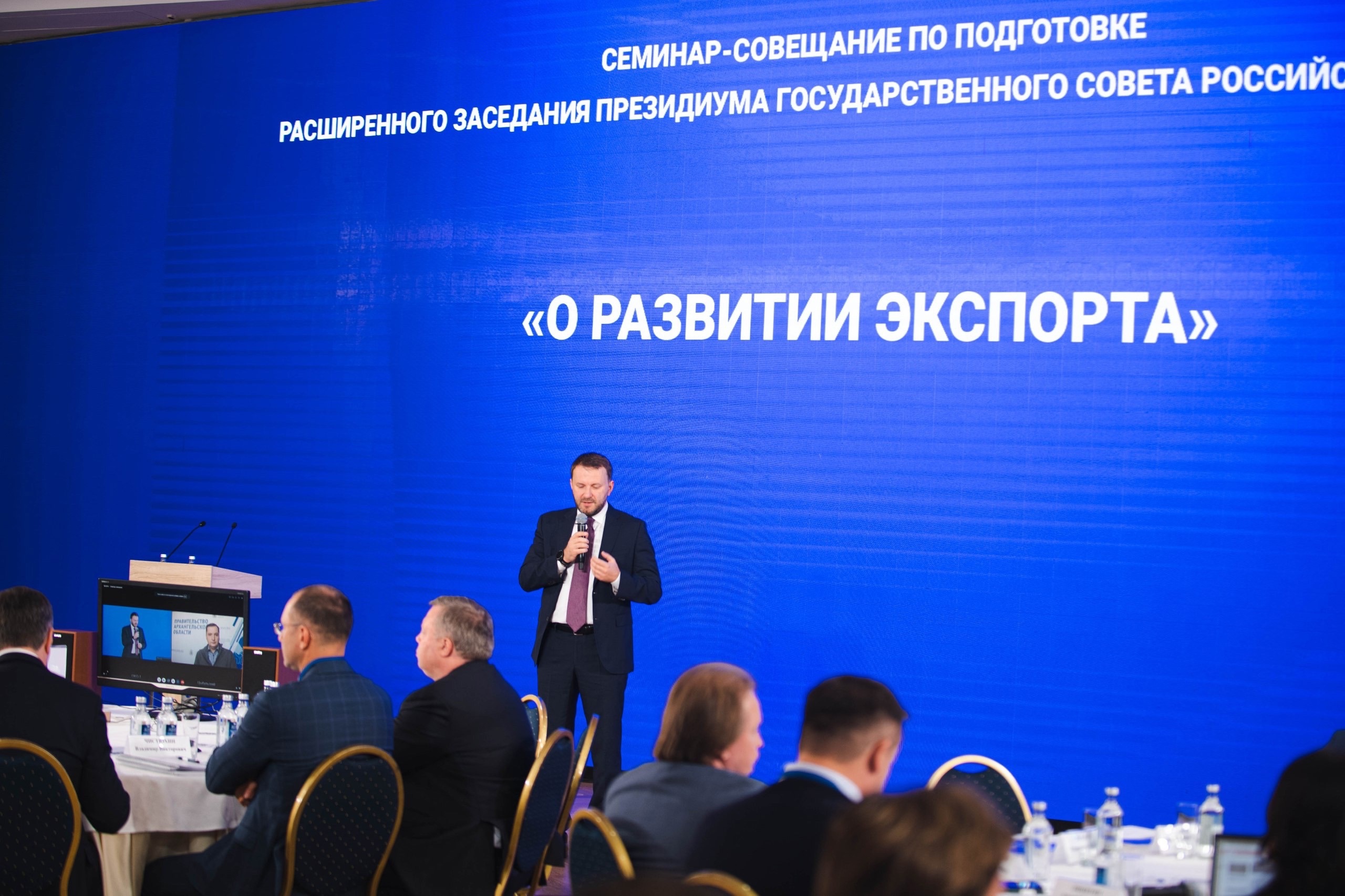 "Увеличение на две трети экспорта несырьевой неэнергетической продукции, товаров высоких переделов к 2030 году – одна из задач, поставленных нашим Президентом в этом году. Предложения по её достижению готовим вместе с губернаторами, представителями федеральных органов власти и институтов развития на семинаре-совещании в Москве под руководством помощника Президента России Александра Геннадьевича Дюмина и заместителя Главы Администрации Президента России Максима Станиславовича Орешкина.