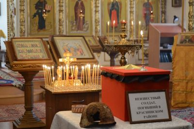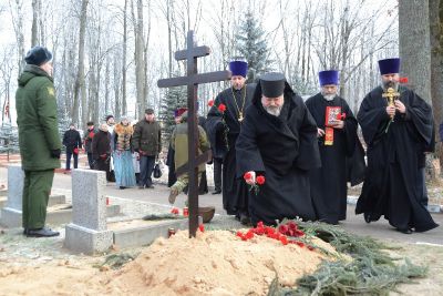 После обряда отпевания в Ильинской церкви еще одного неизвестного солдата, найденного поисковиками на территории Краснинского района, прошла церемония его захоронения в аллее безымянных солдат.