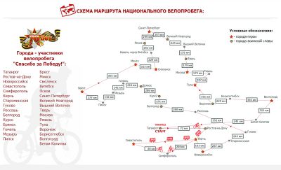 Проект, объединяющий все города-герои и ряд городов воинской славы, расположенных по маршруту велопробега на территории России и Республики Беларусь, посвящен 70-летию Великой Победы. Велопробег пройдет при поддержке Министерства Обороны РФ, Министерства образования и науки РФ, Министерства спорта РФ, Федерации велосипедного спорта РФ, Федерального Агентства по делам молодёжи.