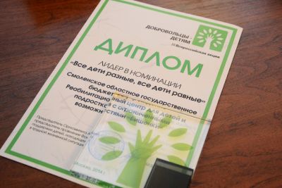 Смоленское областное государственное бюджетное учреждение «Реабилитационный центр для детей и подростков с ограниченными возможностями «Вишенки» удостоилось памятного знака и диплома лидера III Всероссийской акции «Добровольцы – детям» в номинации «Все дети разные, все дети равные» (лучшие практики содействия социальной интеграции детей, находящихся в трудной жизненной ситуации).