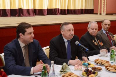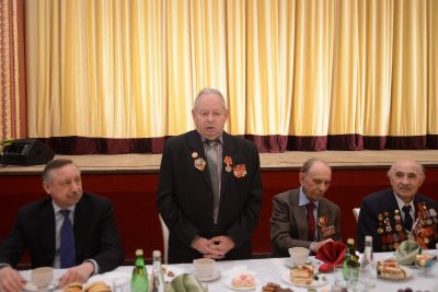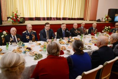 После торжественной церемонии Александр Беглов и Алексей Островский пообщались с Победителями за чаепитием. Обращаясь к собравшимся, Александр Беглов тепло и сердечно поздравил ветеранов с предстоящим 70-летием Победы от имени Президента России Владимира Владимировича Путина. Он также передал наилучшие пожелания ветеранам города-героя Смоленска от ветеранов Города воинской славы Ельни.