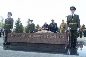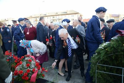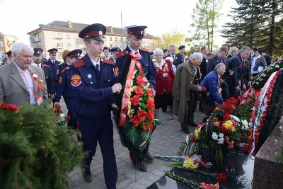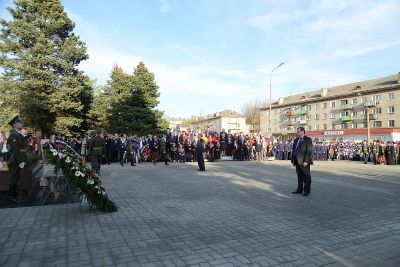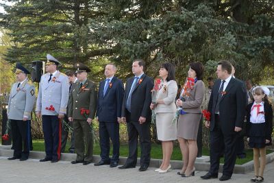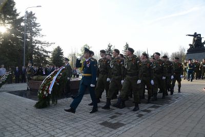 Участники и гости церемонии открытия Вечного огня почтили память защитников Отечества Минутой молчания, после чего возложили к мемориалу венки и цветы.