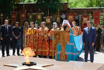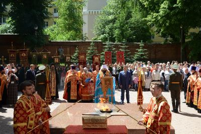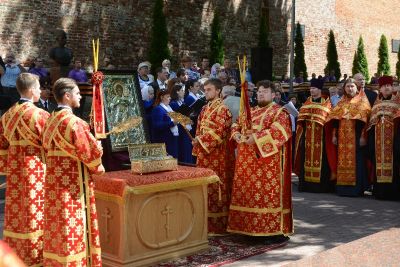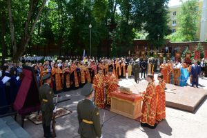 После молебна, литии в память о погибших защитниках Отечества и прикладывания верующих к деснице великомученика Георгия Победоносца, святые мощи перенесли в Успенский кафедральный собор города Смоленска, где они до вечера будут доступны для поклонения верующих.