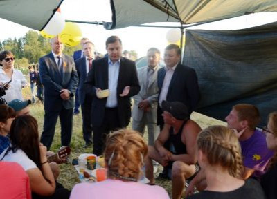 В этот же день глава региона посетил палаточный лагерь VI Международного туристического фестиваля «Соловьева переправа». Алексей Островский пообщался с организаторами, делегациями муниципалитетов, а также принял приглашение отведать полевой каши.