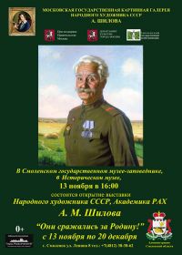 В рамках юбилейных мероприятий, приуроченных к празднованию 70-летия Победы в Великой Отечественной войне, с 13 ноября по 20 декабря в Историческом музее Смоленского государственного музея-заповедника пройдет выставка произведений народного художника СССР, академика Российской академии художеств Александра Шилова «Они сражались за Родину!».