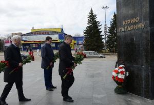 В первую очередь, отдавая дань уважения космическому первопроходцу, полномочный представитель Президента Александр Беглов и Губернатор Алексей Островский возложили цветы к памятнику Ю.А. Гагарину.