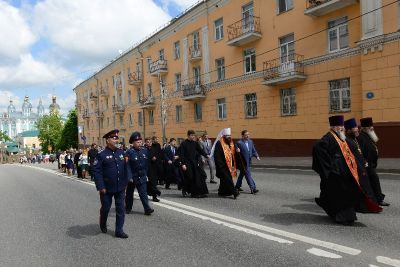 По окончании литургии на улицу Кирилла и Мефодия, к мемориальной доске святым равноапостольным братьям направился Крестный ход, в котором приняли участие руководители области, священники и педагоги, школьники и студенты, военнослужащие и курсанты, общественные и культурные деятели, многочисленные прихожане храмов Православной Смоленщины.