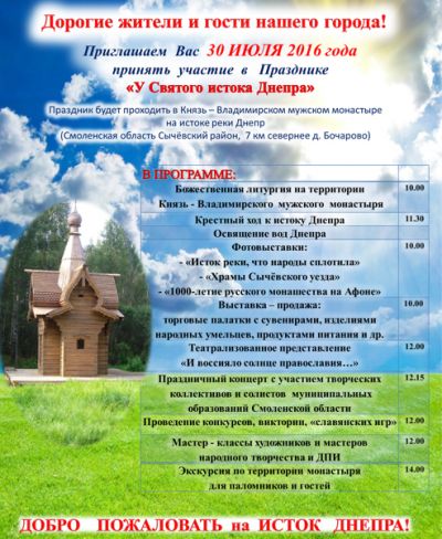 29-30 июля на территории Свято-Владимирского мужского монастыря, расположенного в Сычевском районе, пройдет праздник «У СВЯТОГО ИСТОКА ДНЕПРА», посвященный Дню Крещения Руси. Мероприятие проводится при поддержке Администрации области по благословению Святейшего Патриарха Московского и всея Руси Кирилла.