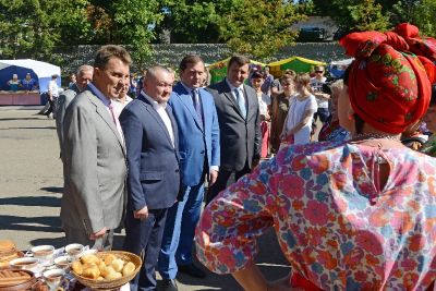 В рамках праздничных мероприятий Губернатор посетил сельскохозяйственную ярмарку, на которой была представлена продукция местных товаропроизводителей, а также выставку декоративно-прикладного искусства «Город мастеров».