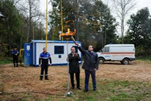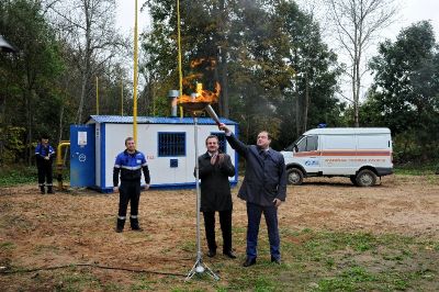 В завершение церемонии Алексей Островский и Сергей Черезов зажгли факел, символизирующий запуск природного газа в деревне Лешно.