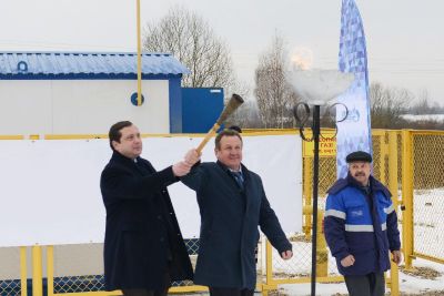 В завершение церемонии Алексей Островский и Сергей Черезов зажгли факел, символизирующий запуск "голубого топлива" в деревне Стегримово.