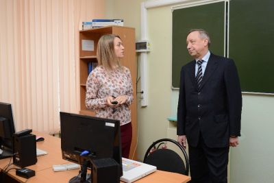 Александру Беглову продемонстрировали компьютерный класс, в котором за специальным компьютером с сенсорной клавиатурой могут заниматься ребята, чьи заболевания связаны со зрительными органами и с нарушениями функции моторики. Дополнительно для детей с нарушением органа слуха приобретены портативные усилители звука.