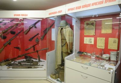 Экспозиция включает вещи бойцов рабоче-крестьянской Красной Армии, огнестрельное оружие, обезвреженные боеприпасы, подлинные фотографии и документы, которые были найдены бойцами поисковых отрядов, а также личные вещи, документы, фотографии ветеранов, переданные в дар краеведческому музею.