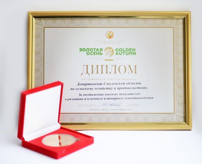 В рамках проведения 18-ой агропромышленной выставки «Золотая осень-2016» Администрация Смоленской области впервые была отмечена золотой медалью за достижение высоких показателей в области племенного и товарного животноводства. Также золотыми медалями и дипломами за достижения в развитии племенного животноводства были награждены три племенных хозяйства региона по разведению крупного рогатого скота молочного направления - ОАО «Смоленское» по племенной работе, СПК «Дружба» Починковского района и ЗАО «Золотая нива» Сафоновского района.
