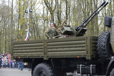 После марша личного состава на площадь выдвинулась боевая техника. В колонне прошли бронетранспортёры БТР-80, зенитно-ракетные комплексы «Оса-АКМ», грузовые автомобили «КАМАЗ» со скорострельными пушками ЗУ-23 и расчетами переносных ракетных комплексов «Игла». Салютный дивизион представил на параде буксируемые пушки ЗиС-3 времён Великой Отечественной войны.