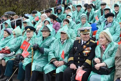 Аплодисментами встречали зрители колонну ветеранов Великой Отечественной войны, тружеников тыла, ветеранов боевых действий, Вооруженных Сил, воинов-интернационалистов. Для тех ветеранов Великой Отечественной войны, которые не смогли встать в строй рядом со своими товарищами, традиционно были предусмотрены специальные зрительские места, с которых они могли наблюдать за всем происходящим.