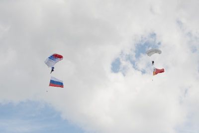 Торжественная церемония открытия фестиваля завершилась выступлением творческих коллективов и приземлением на стадион спортсменов-парашютистов Смоленского аэроклуба «Полет» с флагами России и Смоленской области.
