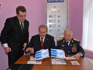 В начале торжественного вечера Сергей Антуфьев и Виктор Горбатко выполнили спецгашение почтового конверта, выпущенного в преддверии полувекового юбилея триумфальной весны 1961 года.