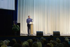 Приветствуя собравшихся, Губернатор подчеркнул: «Считаю вашу профессию одной из самых приоритетных. Быть учителем – высокое призвание и большая ответственность, поскольку в ваших руках находится будущее России и нашего замечательного региона».