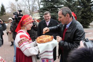 Первых космонавтов зарубежных стран встретили хлебом-солью на крыльце Администрации Гагаринского района. Затем гостей принял глава администрации района Владимир Иванов. После непринужденной беседы за чаепитием руководитель района торжественной вручил астронавтам памятные сувениры.