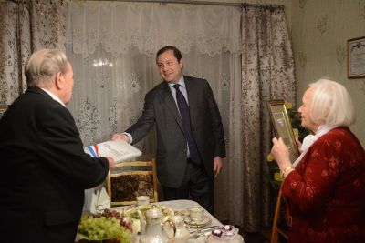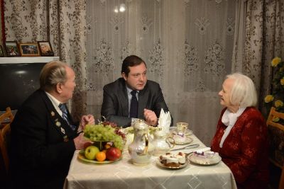 За плечами у семьи Волковых большое трудовое прошлое, огромный жизненный опыт. Во время Великой Отечественной войны Борис Платонович воевал в партизанском отряде, ходил в разведку, был ранен. С 1974 года он трудился механиком на Ярцевском чугунолитейном заводе, а Надежда Васильевна более 20-ти лет проработала учителем начальных классов в средней школе № 8. Алексей Островский рассказал Надежде Васильевне, что сегодня посетил ее бывшую школу, чтобы решить проблемный вопрос с бассейном. «Спасибо Вам, Алексей Владимирович, за это, что заботитесь о нас, стариках, о детях, обо всех помните. Дай Бог Вам крепкого здоровья, упорного труда, настойчивости», - поблагодарила Надежда Волкова.