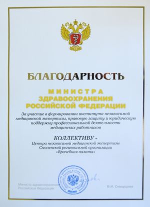 В Москве в ходе итоговой коллегии Министерства здравоохранения России коллектив Центра независимой медицинской экспертизы Смоленской региональной организации «Врачебная палата» получил благодарность министра здравоохранения Вероники Скворцовой за участие в формировании института независимой медицинской экспертизы, правовую защиту и юридическую поддержку профессиональной деятельности медицинских работников.