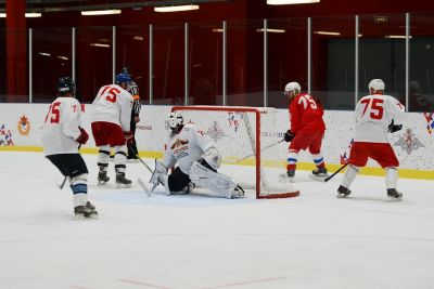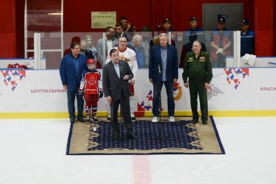 Продолжились торжества на ледовой арене ЦСКА, где состоялся товарищеский матч по хоккею между любительской хоккейной командой Смоленской области и командой «Красные звезды». Перед началом встречи участники церемонии обменялись памятными подарками – вымпелами и майками.