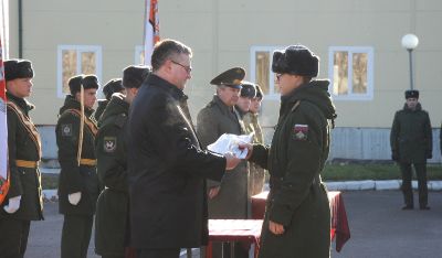 В этот же день на территории воинской части порядка 250 солдат, завершающих прохождение военной службы, попрощались с боевым знаменем. В ходе церемонии также состоялось награждение наиболее отличившихся военнослужащих – вместе с военными билетами молодые люди получили новые звания.