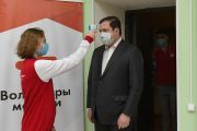 Перед выходом из Регионального волонтерского штаба глава региона также прошел термометрию и продезинфицировал руки.