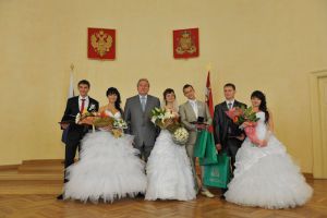 Новобрачные – Андрей и Анна Усердные, Максим и Ольга Остапчук, Кирилл и Ирина Ларионовы – прибыли к парадному подъезду здания и в сопровождении родственников поднялись в большой зал региональной Администрации. Здесь молодоженов сердечно поздравил Губернатор, вручив им Приветственные адреса, памятные подарки и цветы.