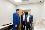 Далее Алексей Островский осмотрел аудитории для отработки алгоритмов выполнения внутримышечных и внутривенных инъекций, освоения навыков сердечно-легочной реанимации, обследования детей, проведения аускультации (медицинской диагностики, заключающейся в выслушивании звуков), помещение серверной, где размещено компьютерное оборудование, и комнату для членов аккредитационных комиссий.