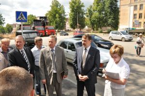Далее делегация направилась на проспект Гагарина. Сметная стоимость объекта составляет 159 млн. рублей. «Смоленская дорожно-строительная компания» идет с опережением графика. За пять месяцев фактическое освоение составило 68,6 млн. рублей против 56 млн. рублей, определенных по документу.