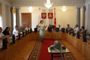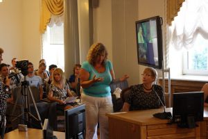 Беседа была организована Департаментом по социальному развитию в форме видеоселектора, чтобы кроме людей с ограниченным возможностями, находящихся в зале, тревожащие темы могли поднять и жители других районов Смоленщины – сегодня это были Гагарин, Вязьма и Рославль. Вела мероприятие председатель регионального отделения Всероссийского общества глухих Татьяна Семченкова.