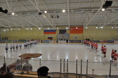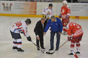 Стартовому матчу первенства предшествовала товарищеская встреча между легендами хоккея СССР и капитанами команд Смоленской области.