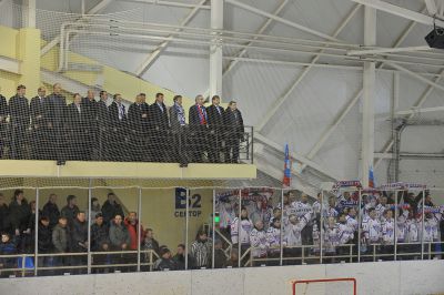 Вечером Сергей Антуфьев и делегация Тверской области, возглавляемая Губернатором Андреем Шевелевым, посетили Ледовый дворец Смоленска, где состоялся третий полуфинальный матч этапа плей-офф Российской хоккейной лиги между местным «Славутичем» и тверской командой ТХК.
