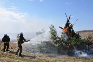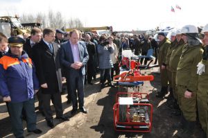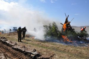В полевых условиях на учебных точках были продемонстрированы технические возможности различных служб и ведомств, привлекаемых для выявления и ликвидации лесных и торфяных пожаров. С помощью тяжелой техники идет опашка очага возгорания, что мешает распространению огня, в ход идут брандспойты. Еще один способ остановить огонь – взорвать термоточку.